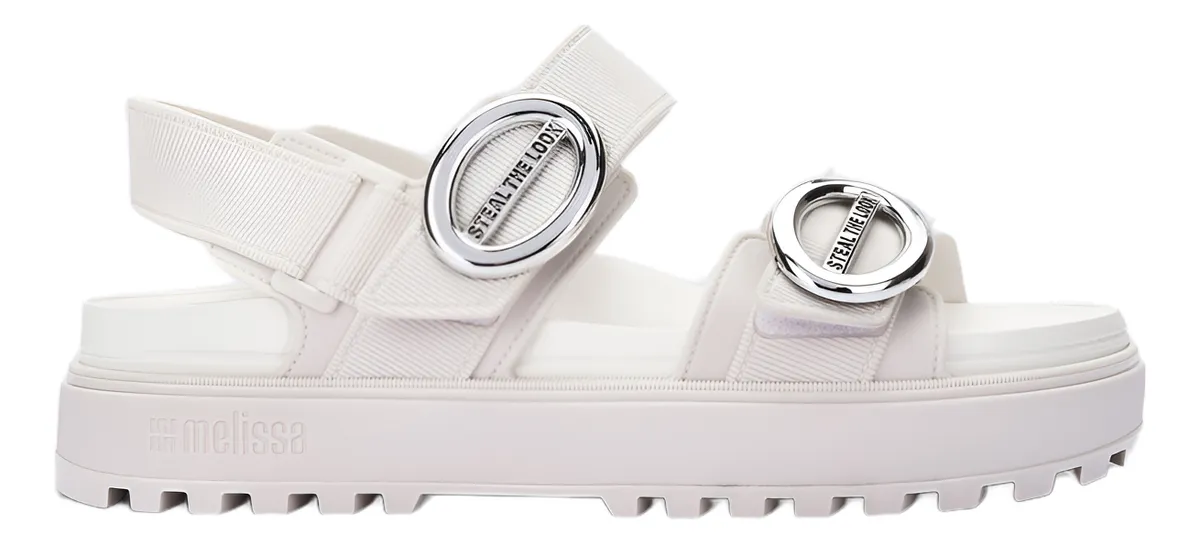 Mais características da Melissa Towny: Cabedal em Melflex Fechamento em Velcro Monograma em Nylon metalizado Palmilha em EVA injetado - Melissa estilo papete; - Calçado de plástico macio, atóxico, extremamente confortável nos pés e com cheirinho exclusivo de Melissa.